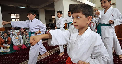 Adana'da bir camide düzenlenen yaz Kur'an kursuna katılan çocuklara karate eğitimi de veriliyor.