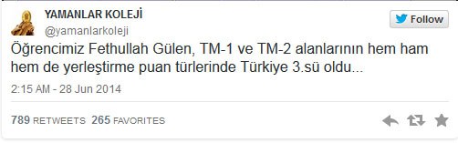 Fethullah Gülen'in yeğeni ve kendisiyle aynı adı taşıyan Yamanlar Koleji Öğrencisi Fethullah Gülen, LYS'de TM 1 ve TM 2 Puan Türlerinde Türkiye 3.sü oldu.