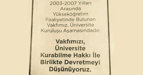 “2003-2007 yılları arasında yükseköğretim faaliyetinde bulunan vakfımız, üniversite kuruluşu aşamasındadır. Vakfımızı, üniversite kurabilme hakkı ile birlikte devretmeyi düşünüyoruz.”