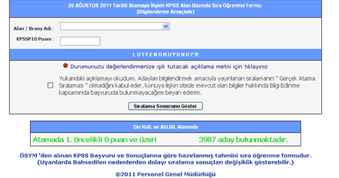 Bir internet sitesinde MEB’in din kültürü atamasına ilişkin bir iddia ortaya atıldı. İddiaya göre; “Milli Eğitim Bakanlığı, 2011 atamalarında din kültürü öğretmenleri içinde toplam mezun ve atama bekleyen sayısını 3987 kişi olarak açıkladı. Aşağıdaki linkten "0" vererek öğrenebilirisiniz http://atama.meb.gov.tr/sonuclar/kpss_sira_26082011/brans_sirasi_bul.asp?Sonuc=sonucGoster